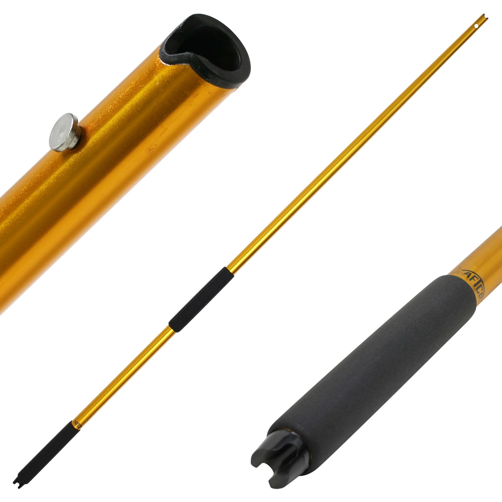 The slim, tapered tips of AFTCO’s Taper-Tip Flying Gaffs slice through water faster and with greater accuracy to minimize the problems of gaffing powerful fish. Like AFTCO’s Taper-Tip Aluminum Gaffs, the shafts of AFTCO’s Flying Gaffs are “swaged” for uniform strength from end to end, thereby eliminating unnecessary weight. The hook seats in a tough plastic insert fitted into the gaff tip, and is held in place by a length of 20 lb. test line tied to a steel post affixed to the shaft. When a fish is gaffed, this line snaps, providing a clean and immediate release. A machined aluminum gimbal at the butt of the shaft secures the attachment rope and along with the plastic insert in the tip, prevents water from seeping into the shaft. If dropped overboard, the gaff handle (minus hook) will float! Shafts are 6′ long, with 1 3/8″ butt diameters fitted with two black non-slip grips, and anodized with a rich Gold or lustrous Black finish for beauty and resistance to corrosion.