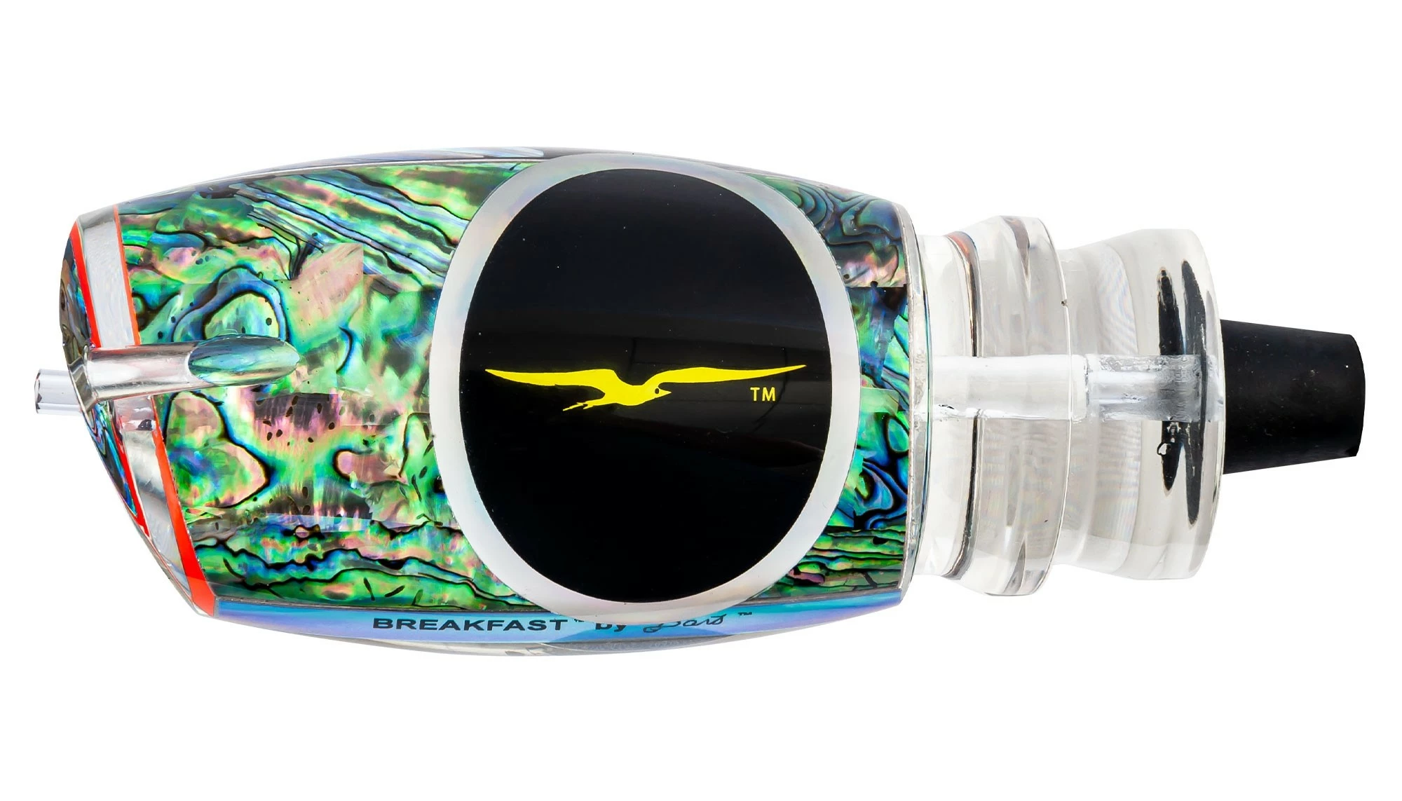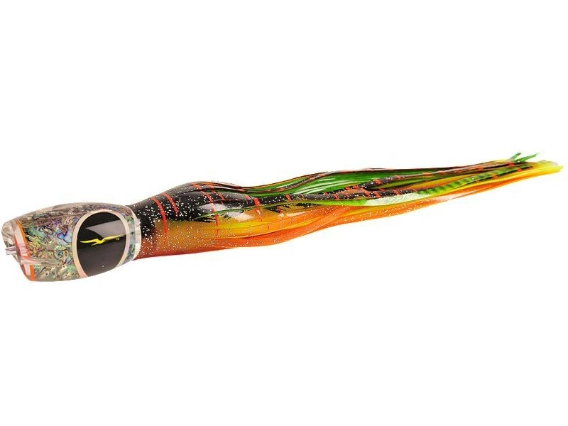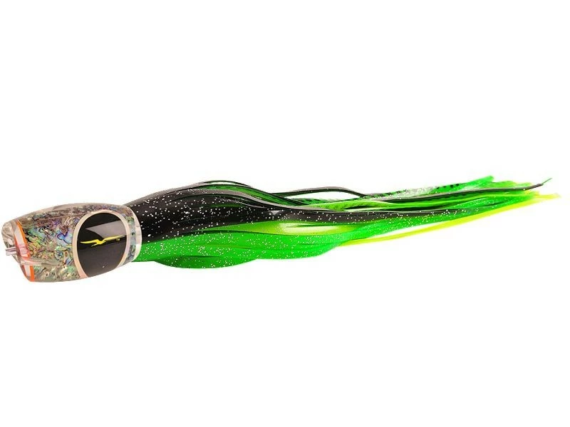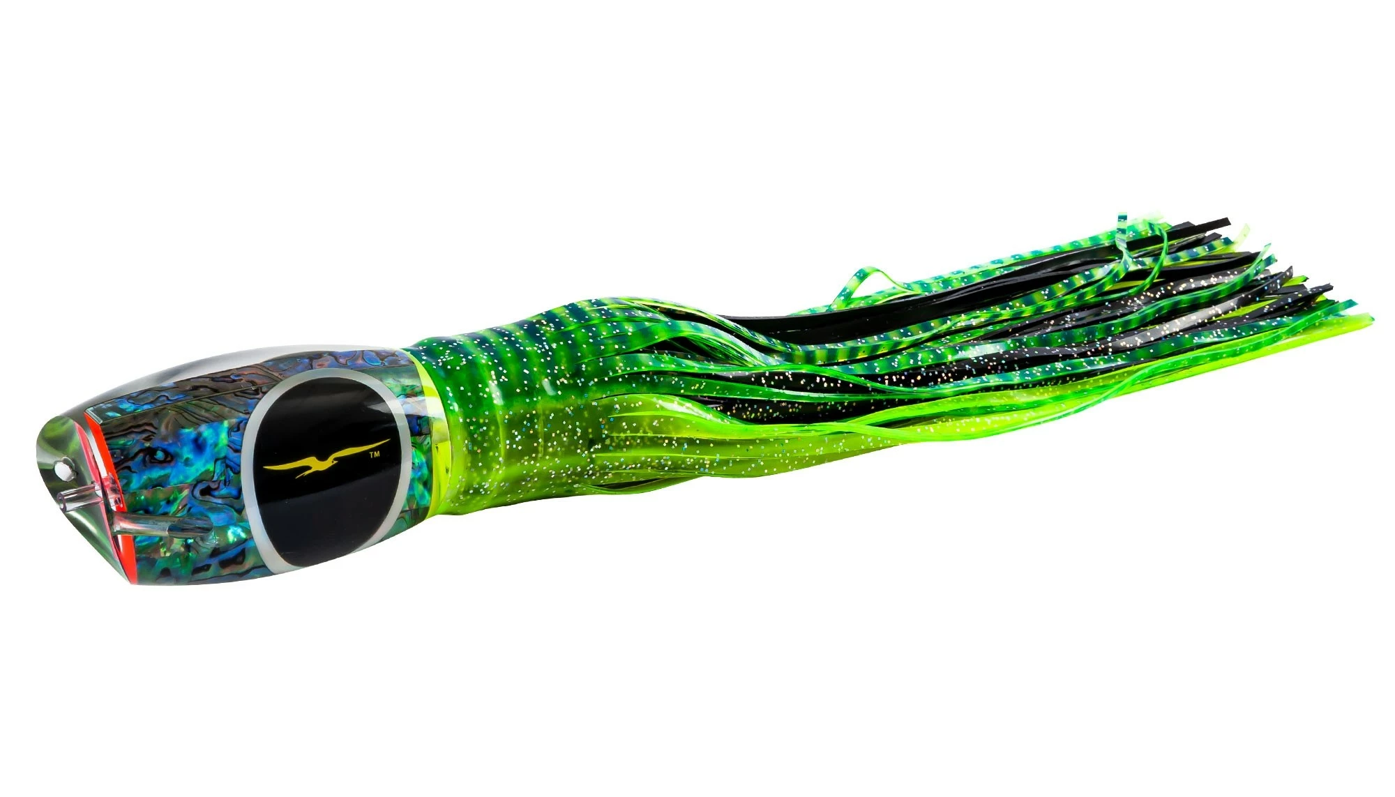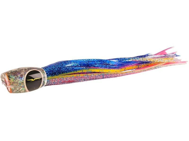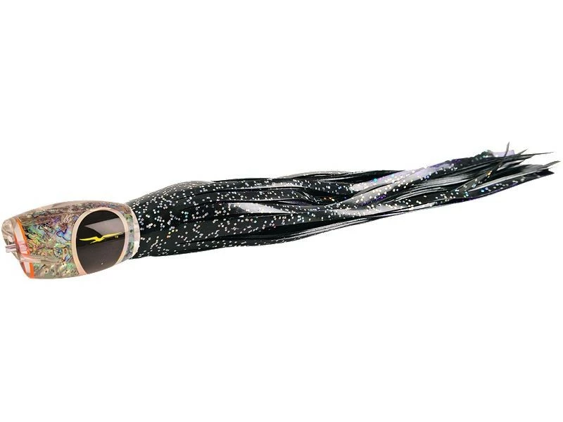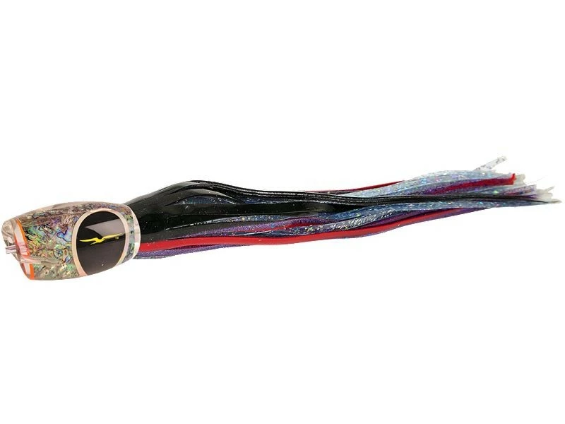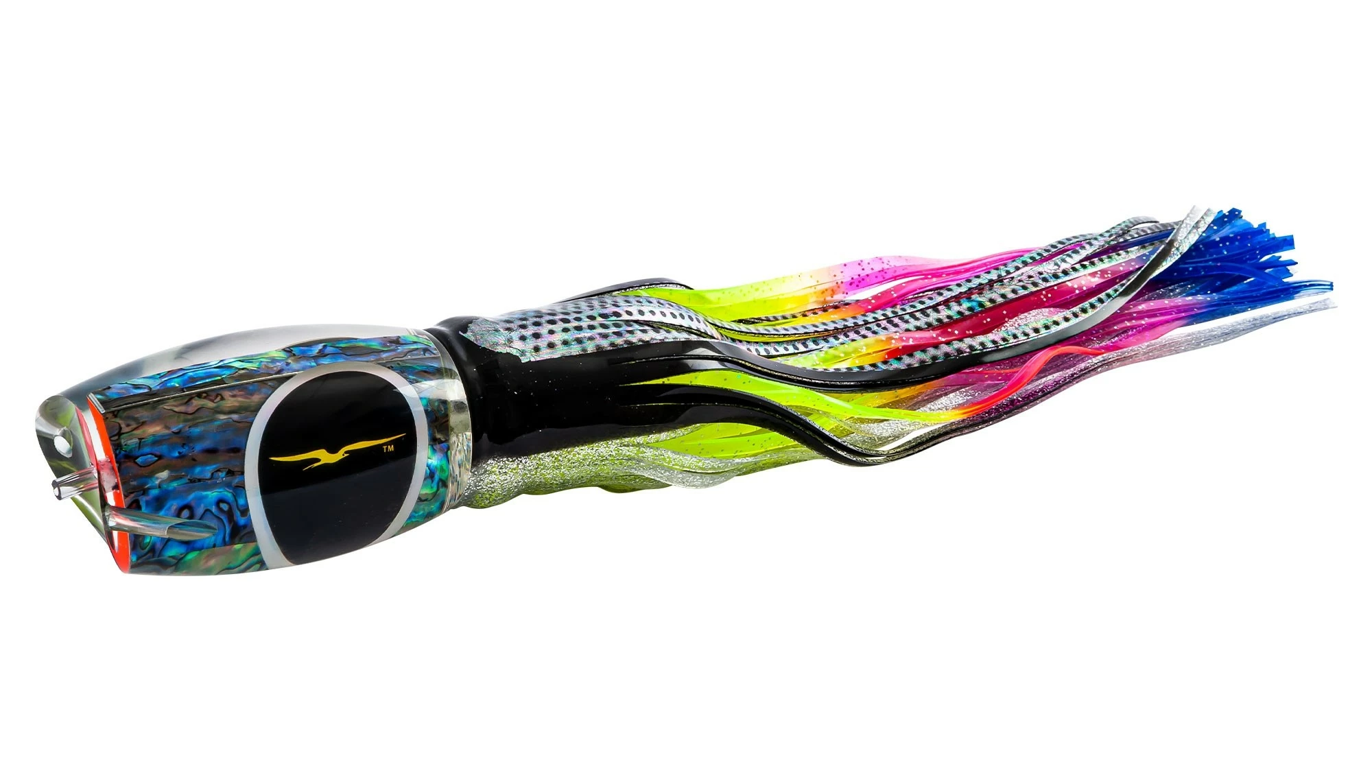 The Black Bart Breakfast is one of Captain Bart Miller’s very favorite creations. This lure has two jet holes that create a massive bubble trail and help enable this lure to swim, dive deep, and then explode on the surface. Troll the Breakfast flat on either corner off the rod tip. Don’t pull this on anything less than 130 lb. tackle. Approximately 19″ in length skirted, best rigged with 12/0 hook.