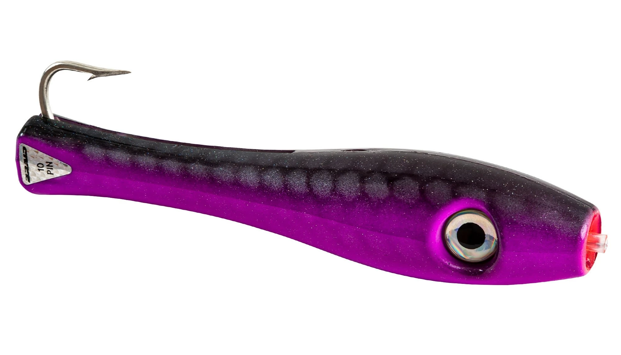 Braid Ten Pin’s irresistible, injured baitfish action and frantic, holographic eyes are unmatched for all gamefish. Counter-balanced with an internal weight to “keel” the bait in an upright position, the smaller models run to 10 knots and the larger one to a remarkable 18 knots. The Pretlane, high impact bodies have a center slot running the length of the lure for its pre-rigged single hook, while their unique slotted backs allow a second hook too.