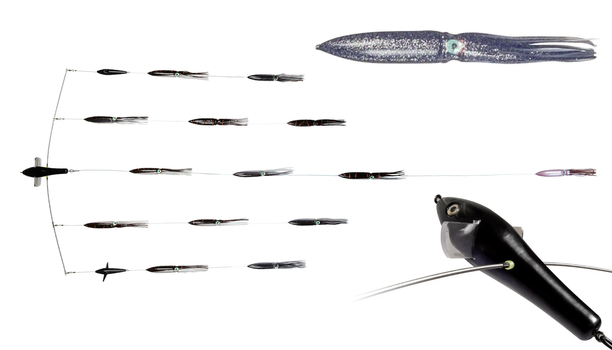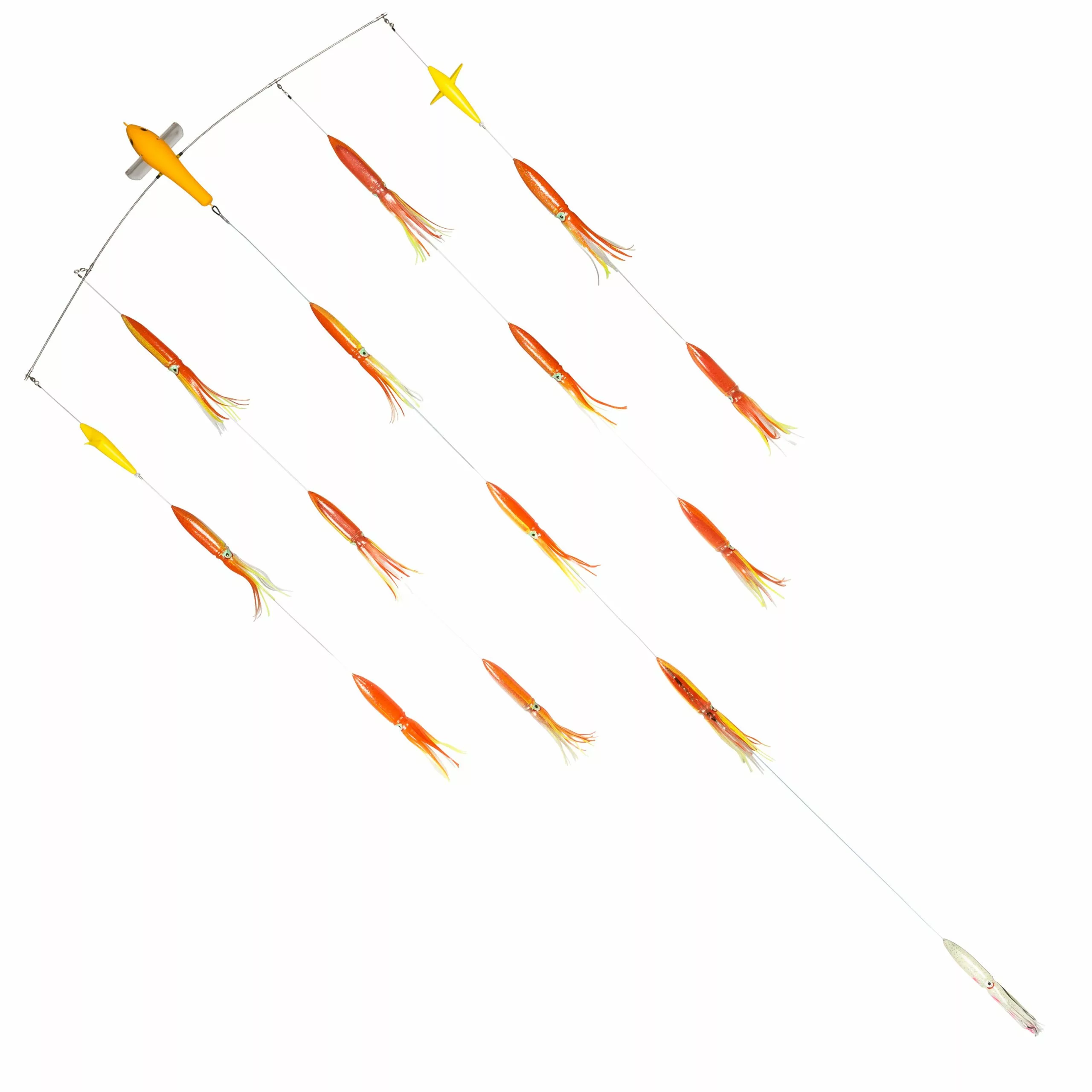 Carlson Offshore Tackle Bird Bars feature a total of 14 bulb squids, numbering 13 teasers, and 1 hook squid. Each bulb squid measures 11″ long, which makes the Carlson Offshore Tackle Bird Bar excellent for catching Blue Fin, Yellow Fin, and other species of tuna.