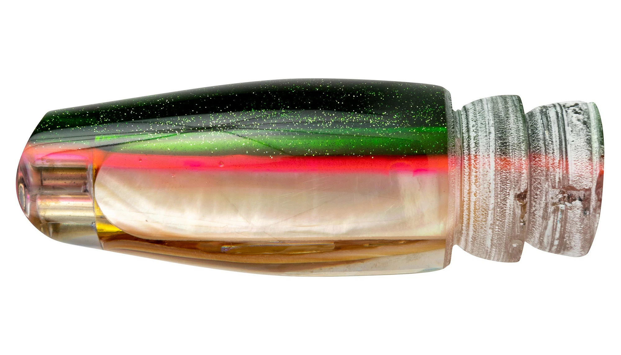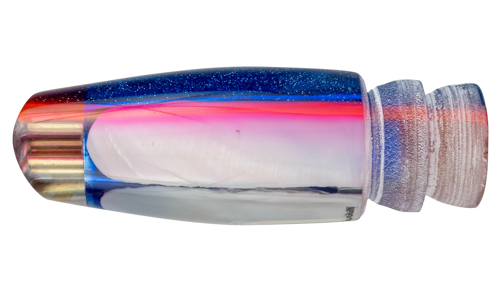 The Coggin Big Slant Scoop is a smaller and thinner version of the venerable Coggins Copa series of lures. A great choice when targeting Striped Marlin, Tuna, big Mahi, and Wahoo. Mother of pearl inserts and hand assembled brass jets are standard on this lure as they are on most of the lures that bear the Coggins name. Skirted Length is 11.5 inches.