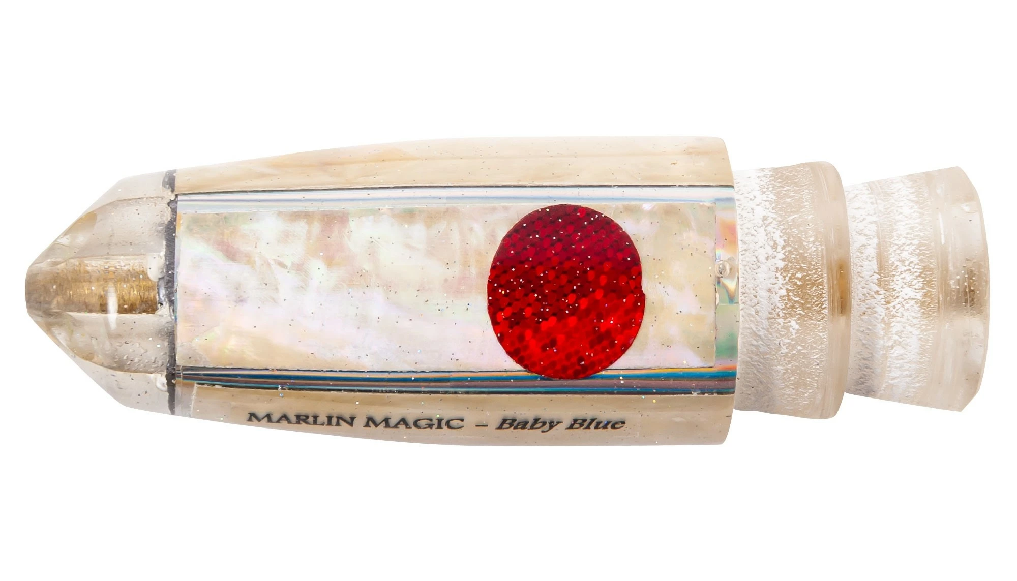 The Marlin Magic Medium Ahi Pussy Rocket Jet/Baby Blue is an awesome lead loaded (8 oz.) bullet lure. Perhaps the perfect shotgun lure, this lure is not only known for catching Tuna it has raised its fair share of big Blues over the years.