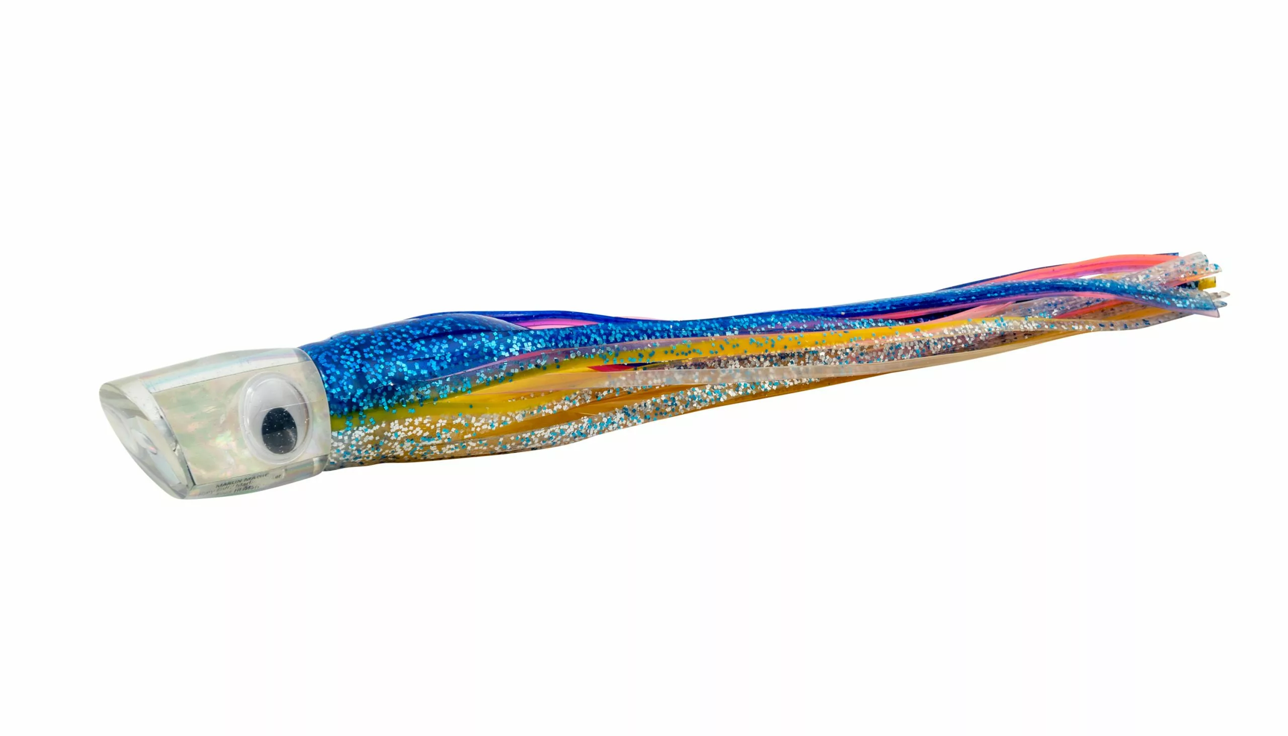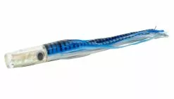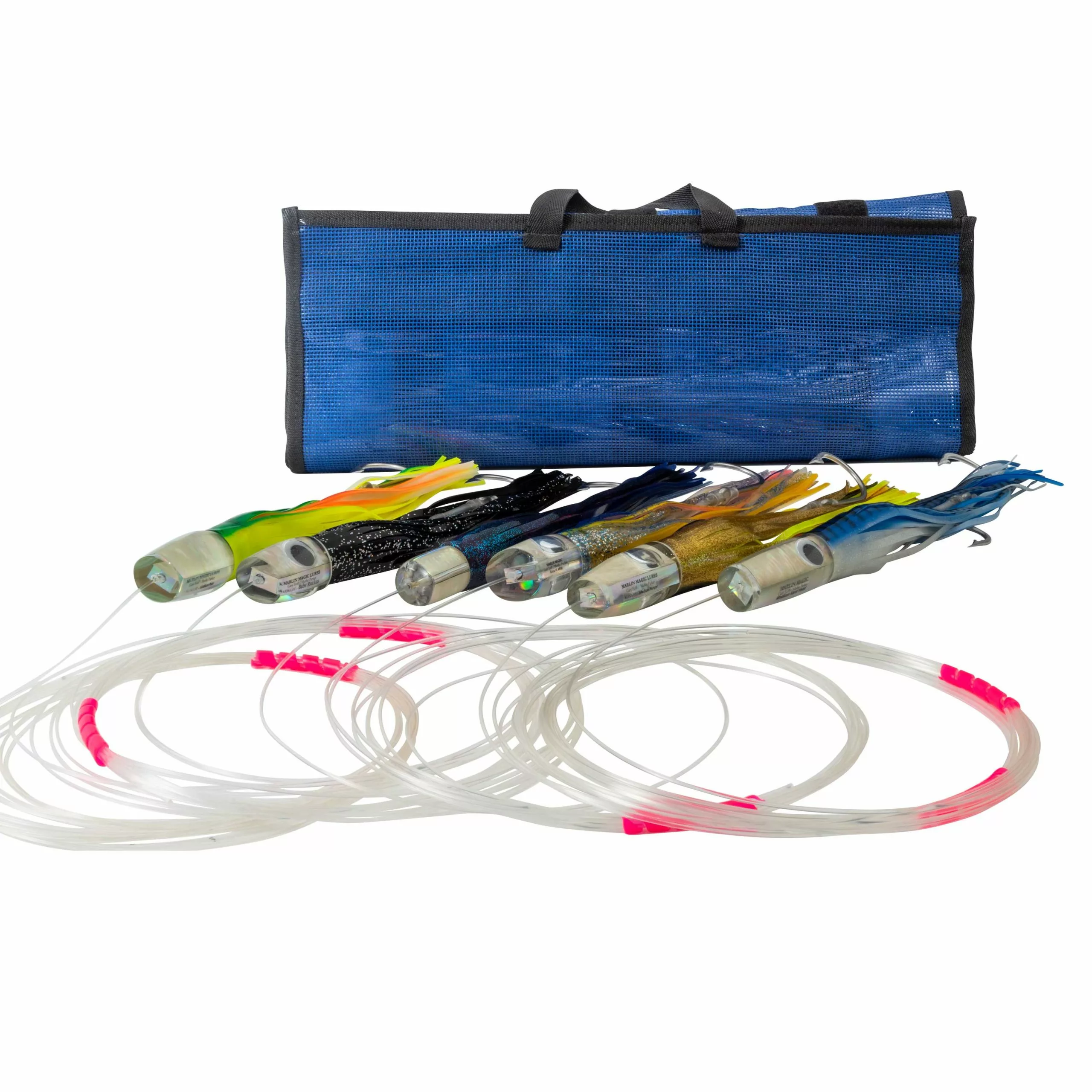 The Marlin Magic Billfish pack includes an excellent selection of lures for chasing Billfish with light to medium tackles. This pack features the following signature head shapes: Medium Pear, Medium Plunger, Baby Ruckus, Medium Hard Head, Zip Rocket, and the Hi-speed AP Jumbo Jet. All six Marlin Magic trolling lures are handmade as shown with clear resin heads, white shell inserts and shaky teddy bear eyes. Pack includes an XL six pocket lure pouch, and the approximate skirted length of each lure is between 12-14 inches. If a rigging option is chosen, leader Length will be approximately 20ft. with a rating of 300lbs.
