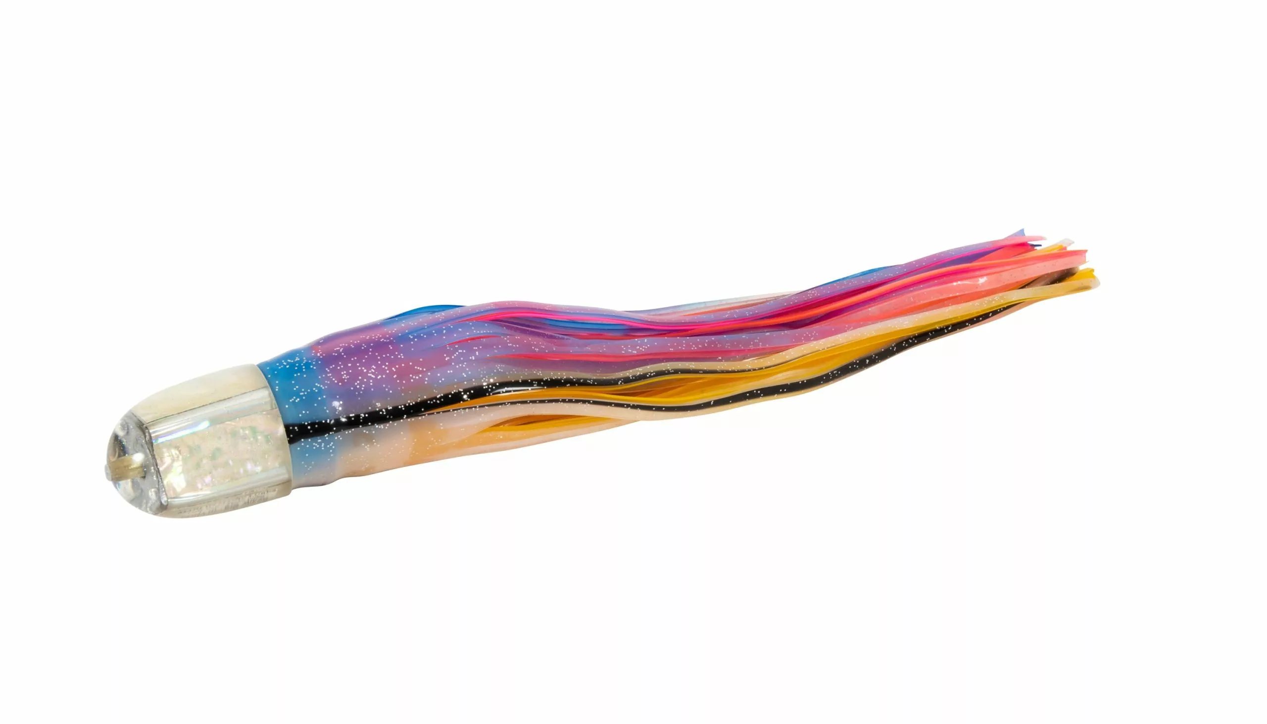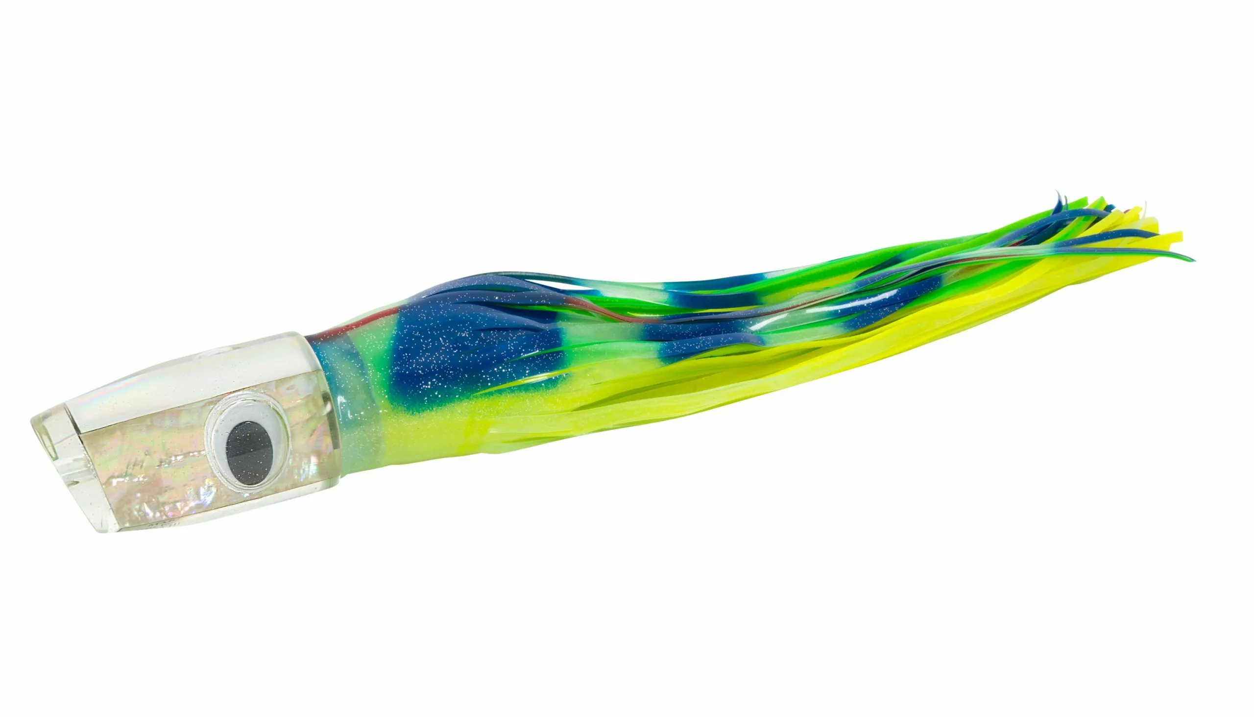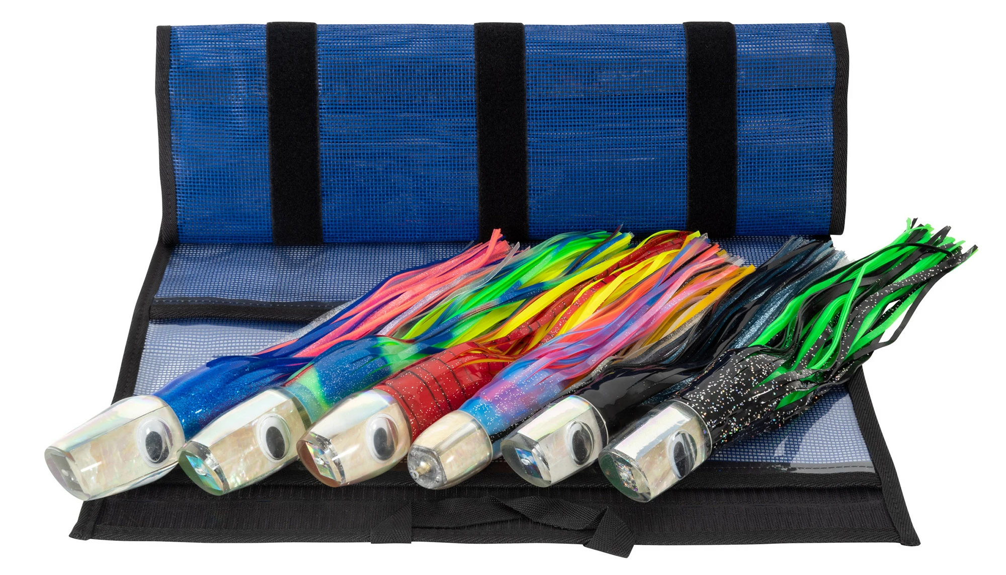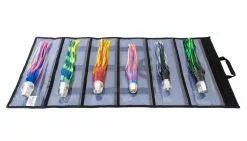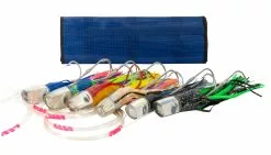 The Marlin Magic Heavy Hitter pack includes all the top producing lures ideal for “Big Fish” anglers hunting larger size gamefish, such as Blue Marlin, Black Marlin, Giant Yellowfin Tuna, and other Tournament winning gamefish. This pack features the following head shapes; Big Dog, Captain’s Choice, Large Henry, Bog Eye, Ruckus, and the “Big Mikey” XL AP Bullet. All six Marlin Magic trolling lures are handmade as shown with clear resin heads, white shell inserts and shaky teddy bear eyes. Pack includes an XL six pocket lure pouch, and the approximate skirted length of each lure is 16-19 inches.