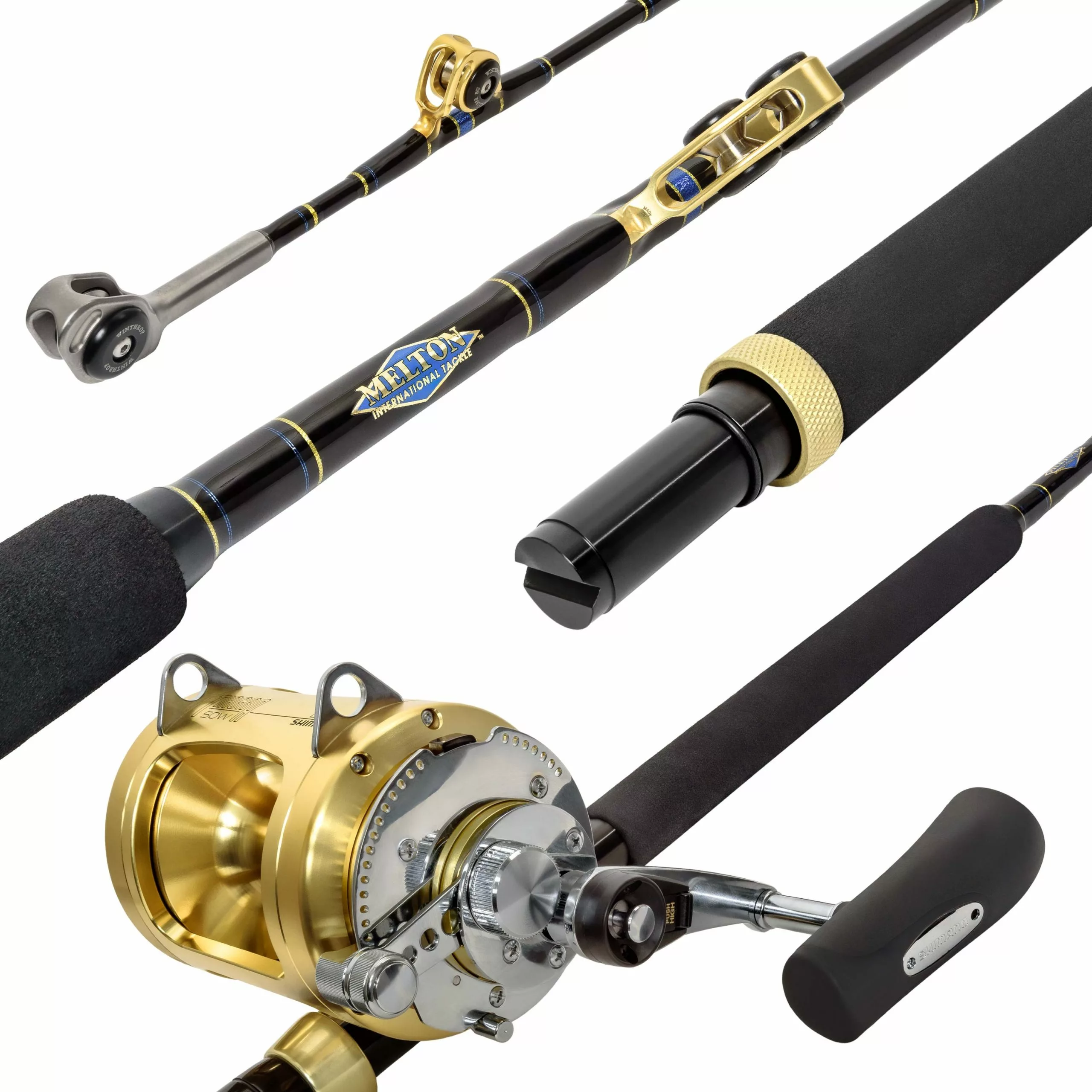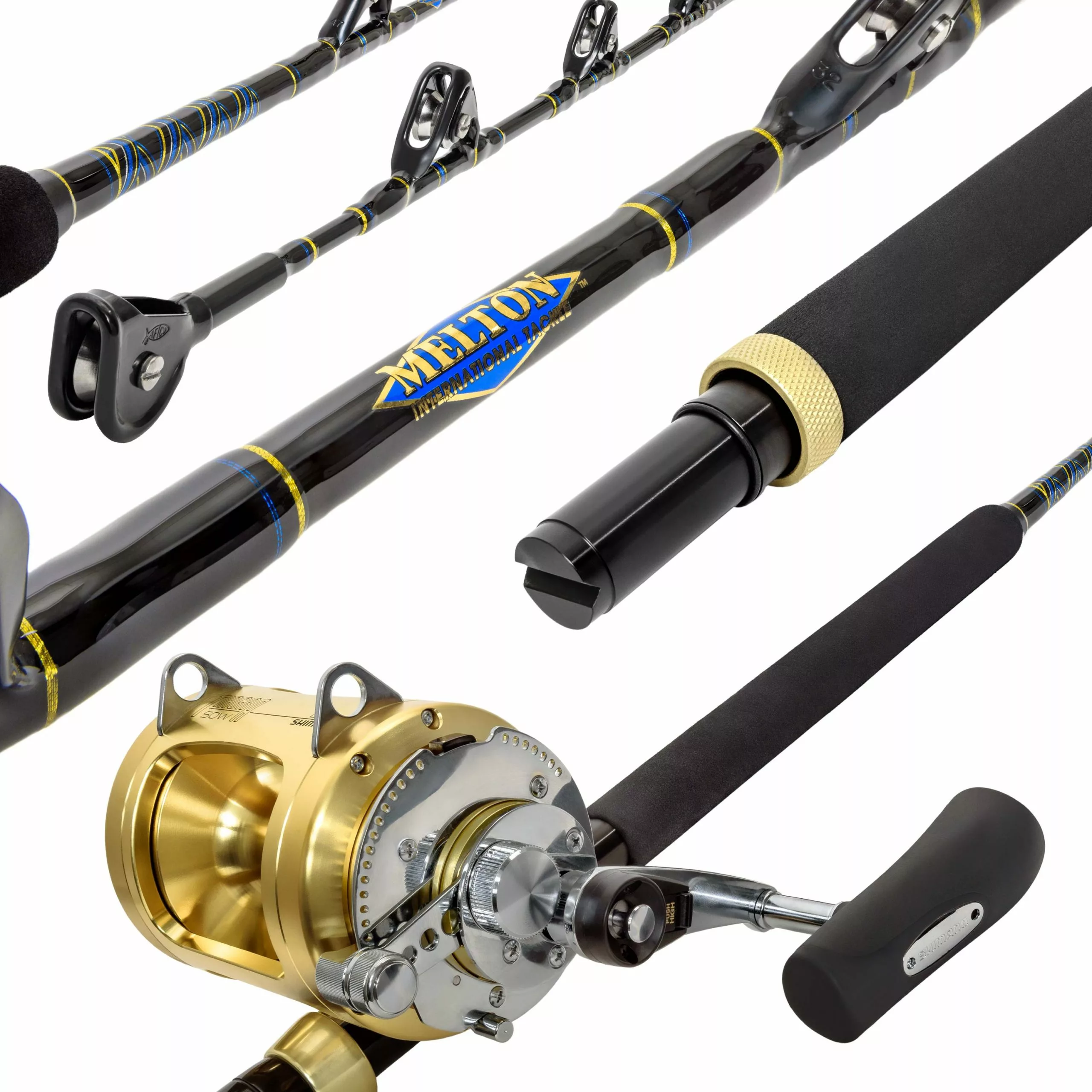 The Melton Tackle Kona/Shimano Tiagra Stand-Up Combos are the ultimate combo for stand-up fishing, pairing the Melton Tackle Kona All-Roller Rods and the Shimano Tiagra 2-Speed conventional reels. Large marlin and tuna lures have considerable drag when being trolled, so we built the Melton Tackle Kona Rods with stiff tips for hook-setting power. Kona Stand-Up Rods are built on custom blanks with long hypalon foregrips for added leverage and the option of either the AFTCO Unibutt or Storabutt. The Black/Silver AFTCO Guides or upgraded Black/Gold Winthrop Guides are triple wrapped in signature Melton colors. The rod models “WO” and “WT” are built on composite graphite/glass blanks, offering additional performance for an unmatched angling experience. Lightweight, yet powerful, these rods are really sweet.