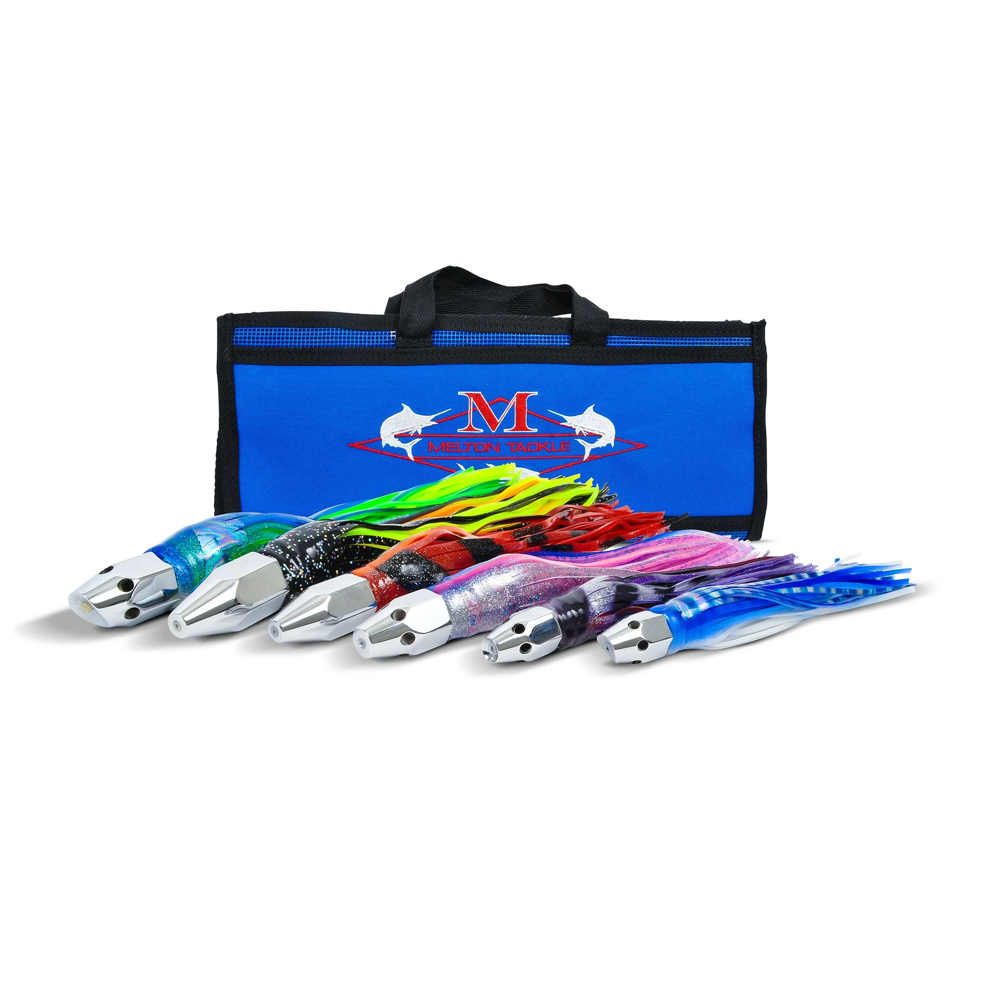 Our jet pack contains: 1- Lg. Cherry Jet, 1- Lg. Bomber Jet, 1- Med. Bomber Jet, 1- Med. Pusher Jet, 1- Sm. Cherry Jet, 1- Sm. Hollowpoint Jet and is sold in a large 6 pocket lure pouch. Available as Unrigged, Rigged, and Super Rigged (Super Rigging includes stainless steel hooks and Seaguar fluorocarbon leader).