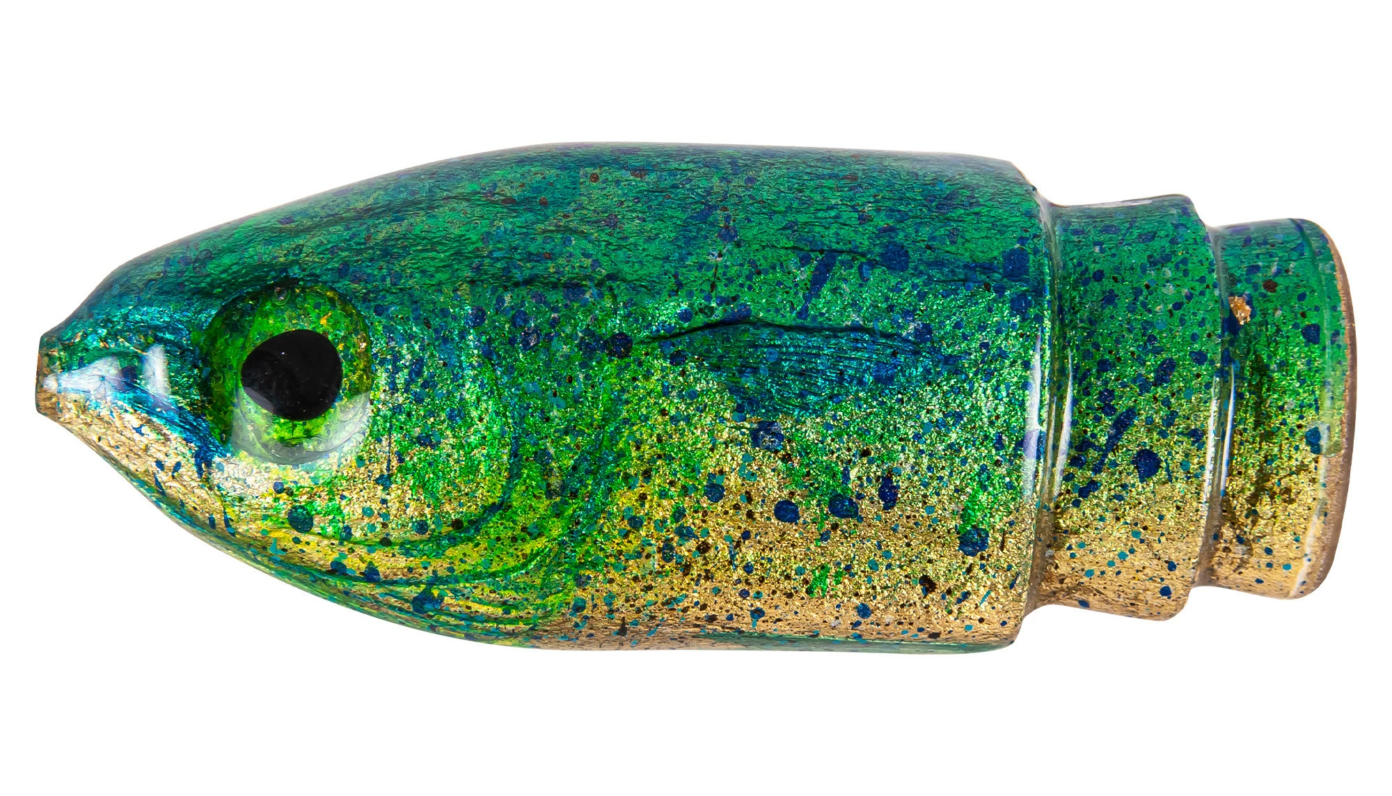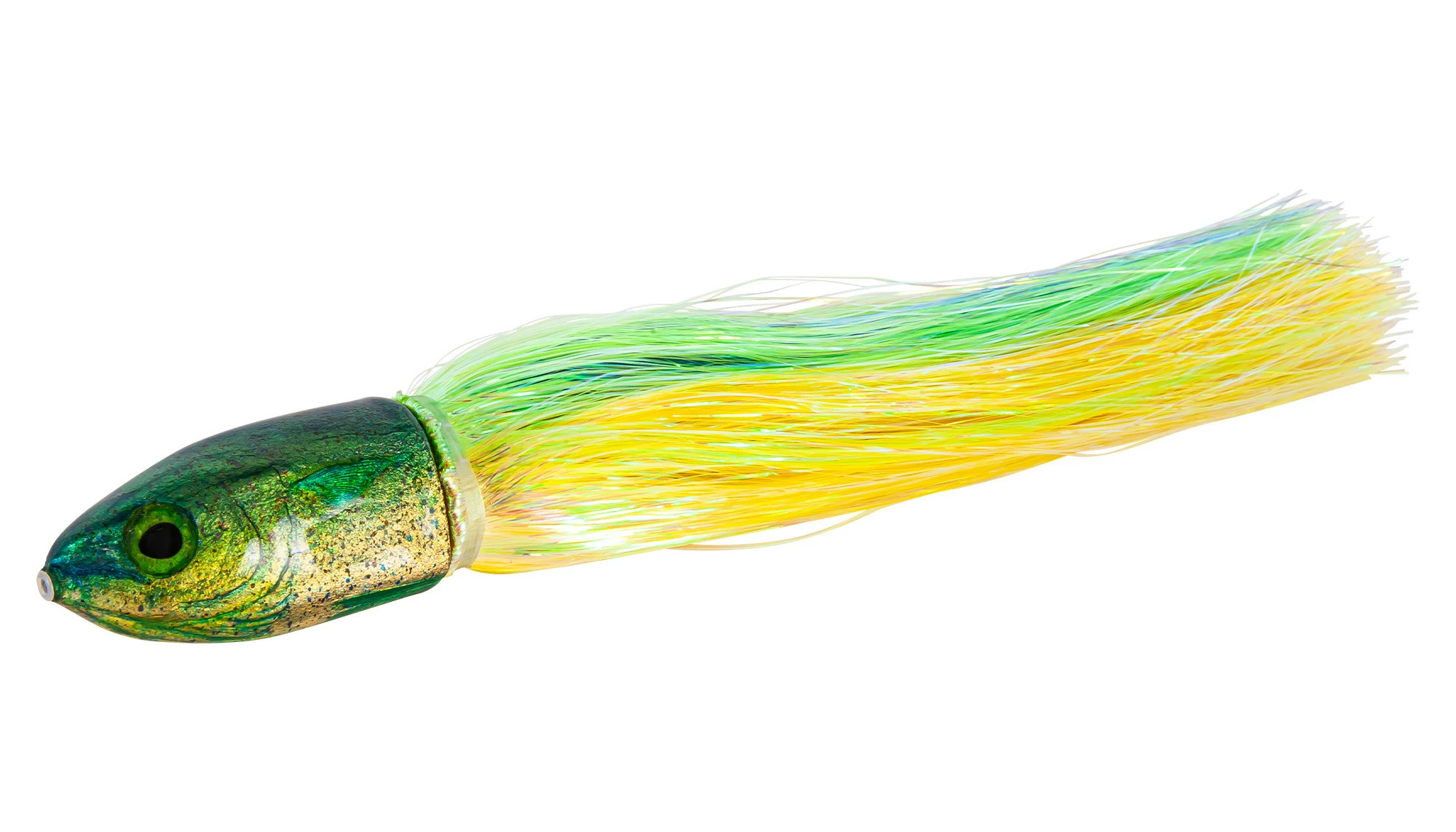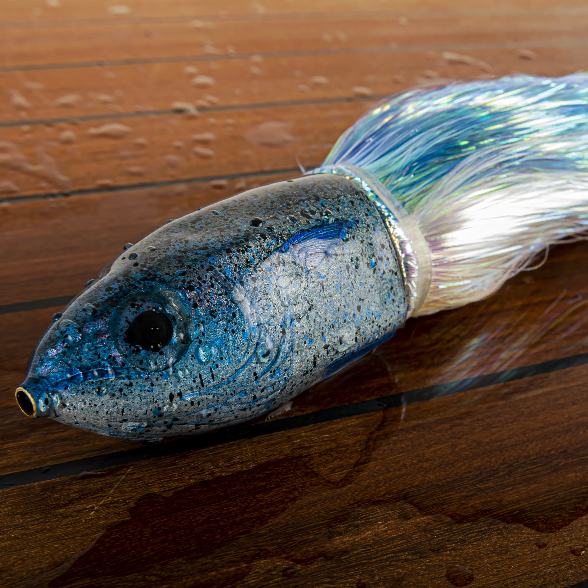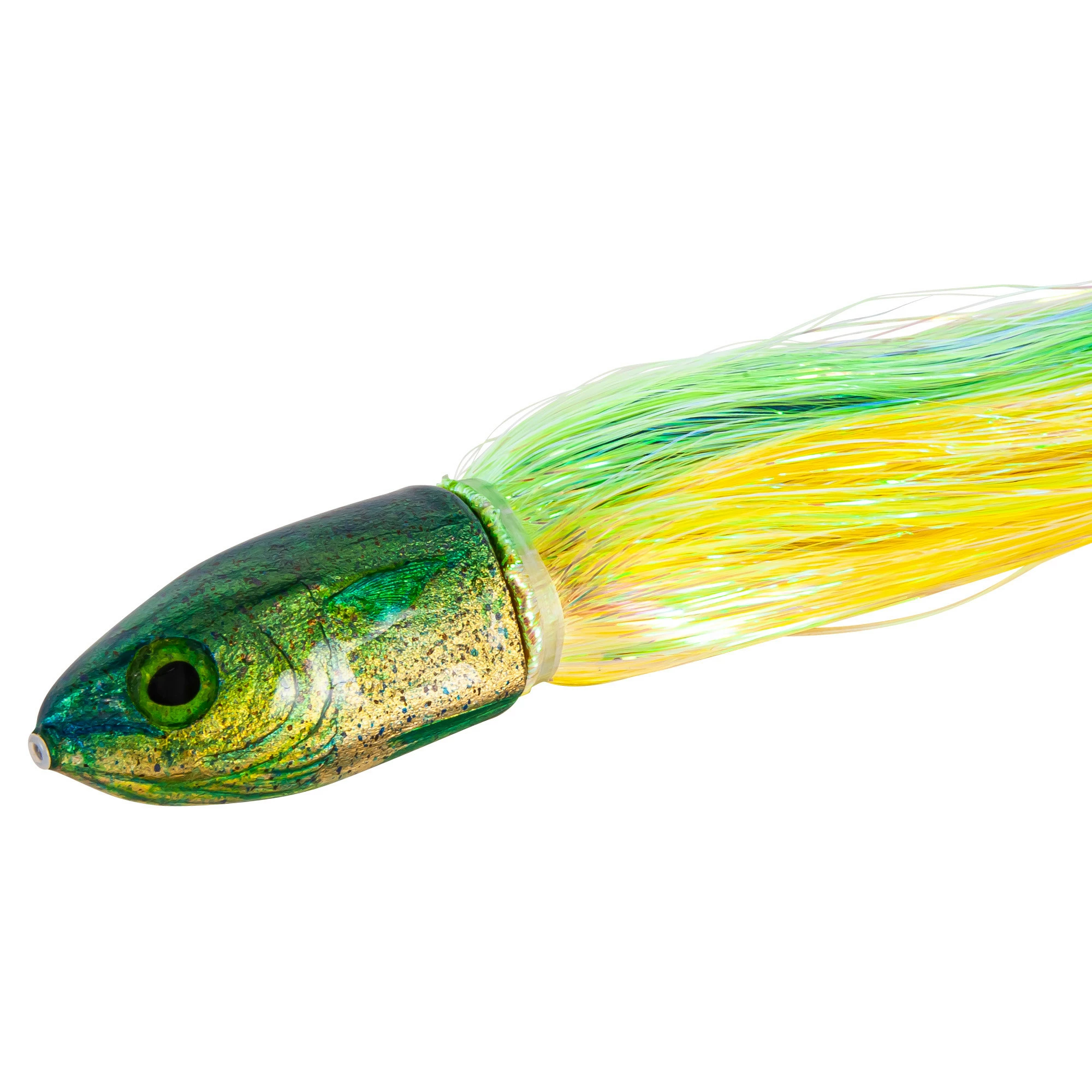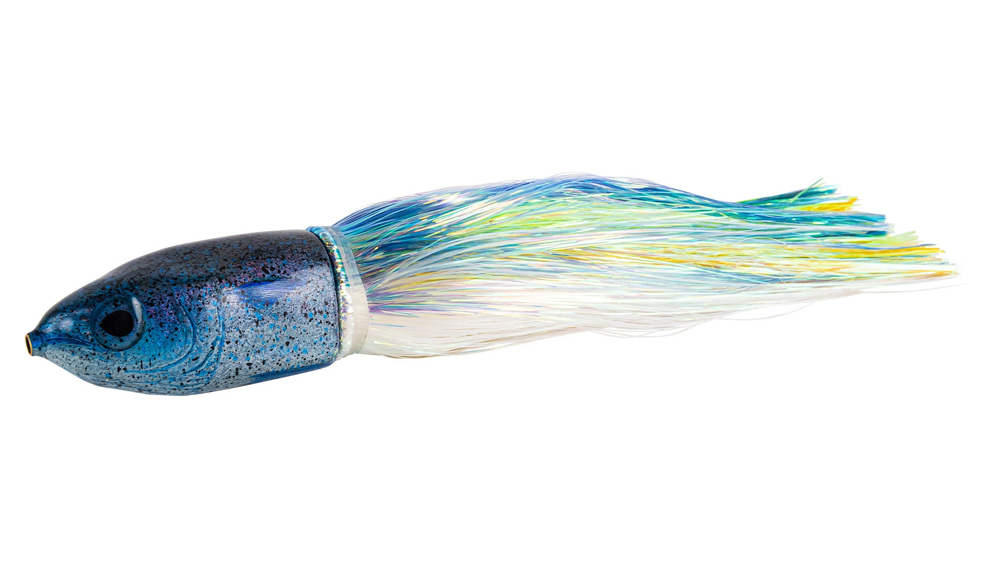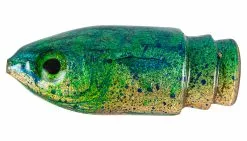 Niiyama Lures 9″ Mahi is a unique lure painted by Jon Niiyama in Hawaii that has bullet shaped head, perfect for balancing. These lures could handle the roughest seas, and are great for all pelagic species. It features a green back with silver and blue splatter and a gold belly. A truly beautiful lure.