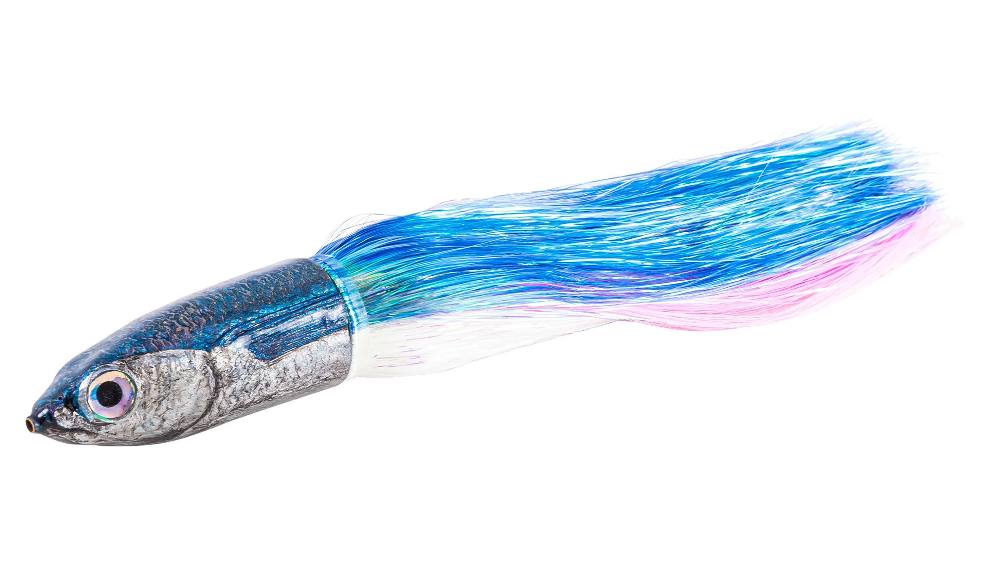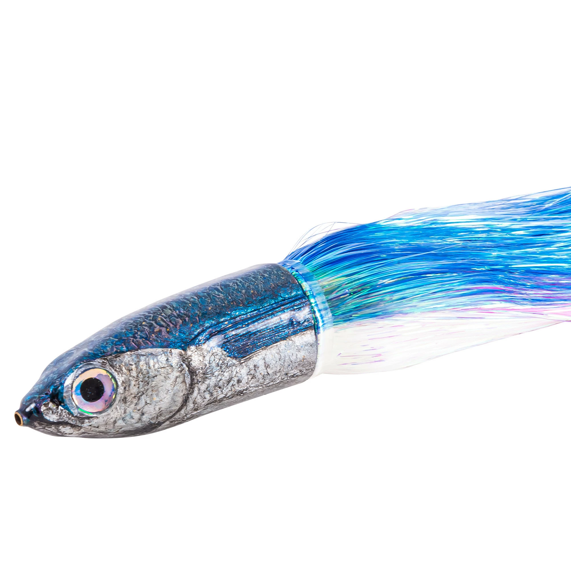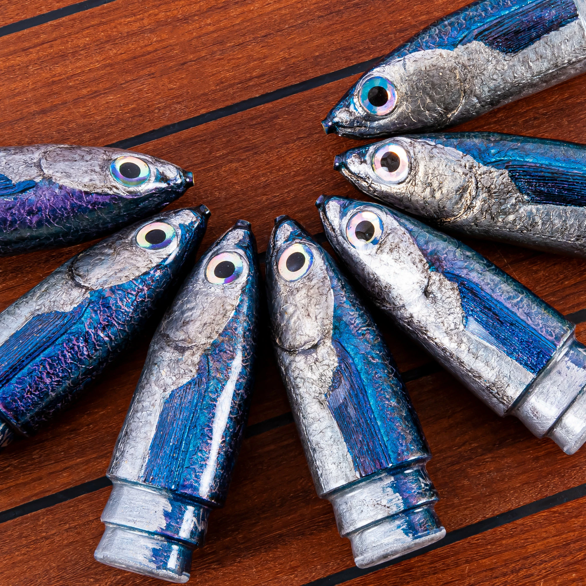 This is not just a work of art, but a very functional and effective lure. We recommend throwing a 10/0 single or double hook rig with 50-130 lb line on this lure and troll it at 5-12 knots for optimal results. The back profile of the steps have an oval shape that is designed for flashabou skirts.