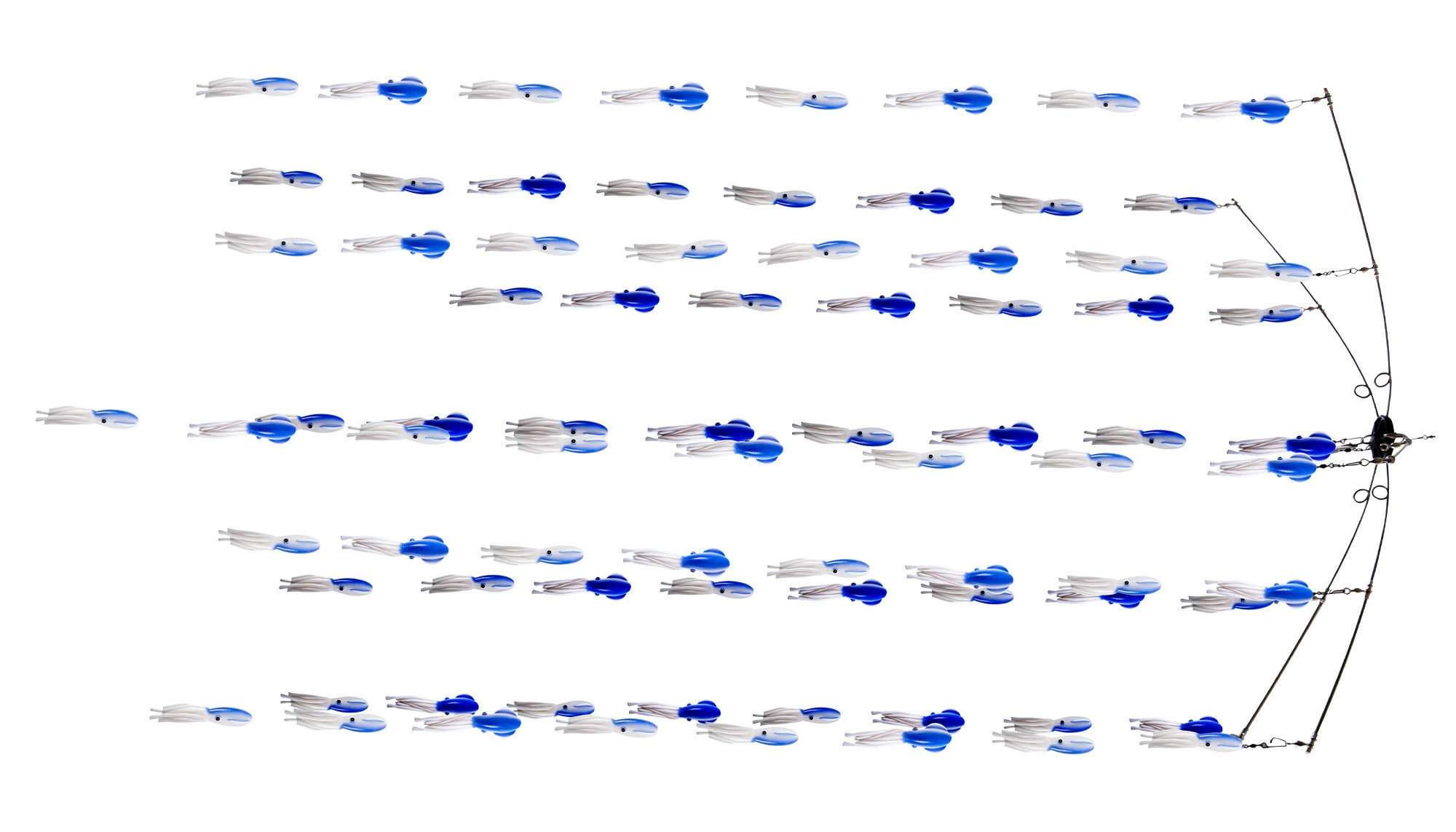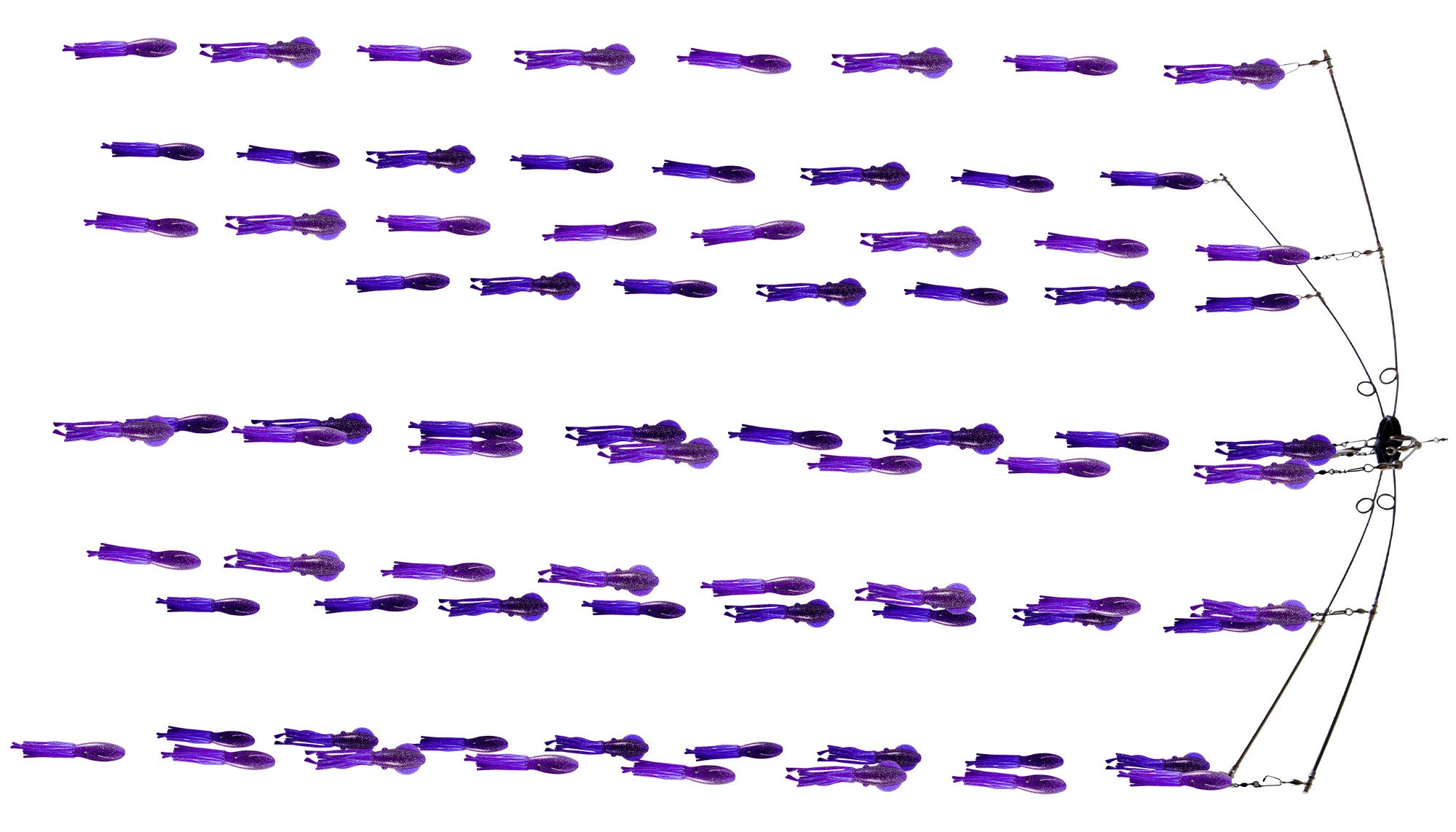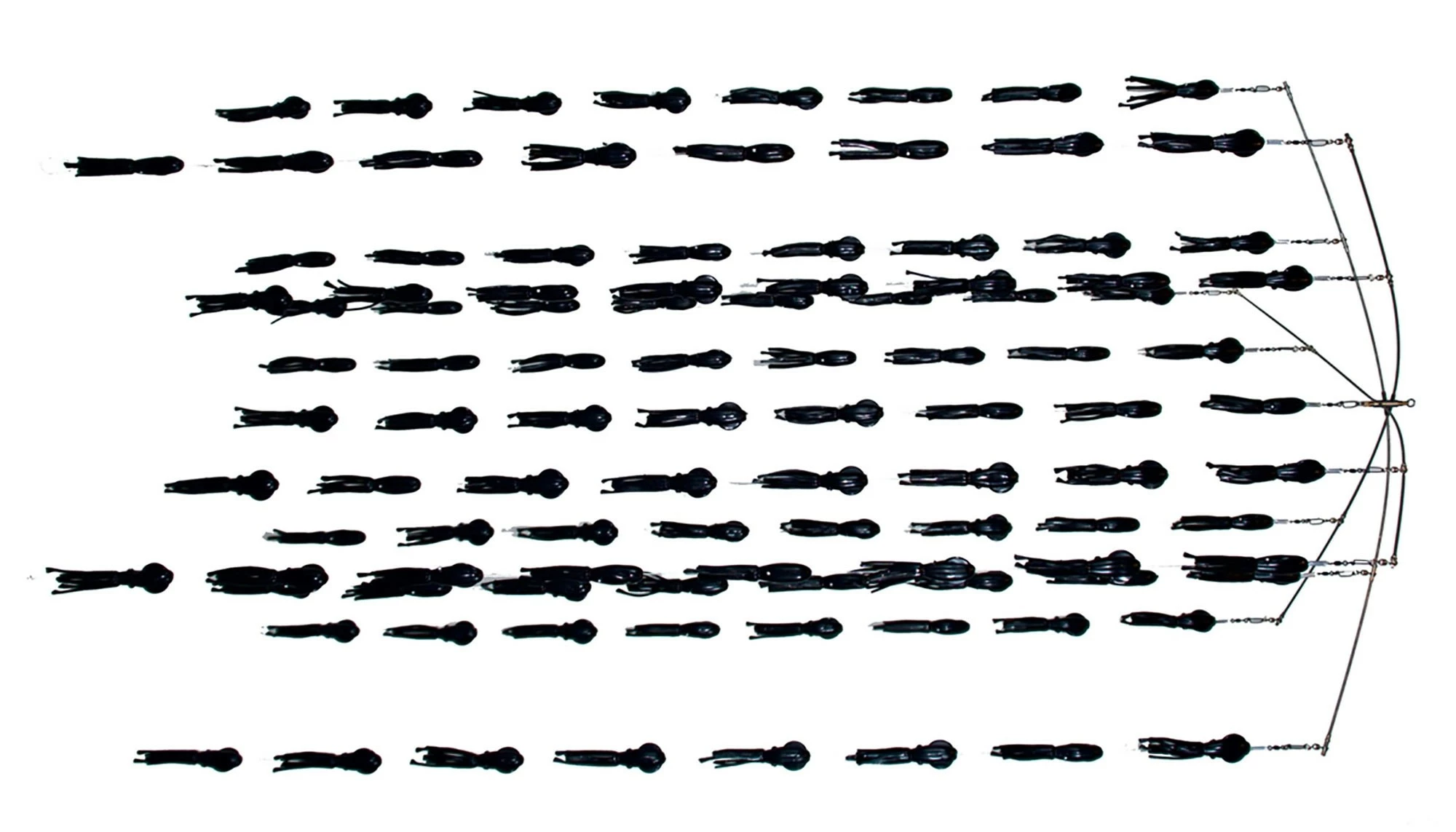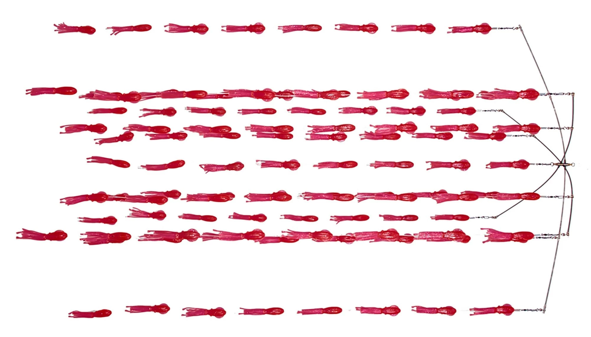 The Fat Daddy Dredge is constructed with 104 5.25 inch Squidnation Fat Daddy Squids. 36 inch stainless steel Squidnation Double Connect Dredge Bar. The large bulb and flexible tentacles make it an action packed dredge. The smaller soft mantles makes it virtually tangle proof. You will be amazed at the ease of deployment. A large dredge that has such a big profile is usually a nightmare to deploy without tangling. These dredges also pull with much less resistance than other artificial dredges. Fat Daddy Squids were customized to be pulled in large numbers with minimal restraint. White Marlin, Big Eye Tuna, Mahi have been attacking the Fat Daddy Style dredges in all of our test runs on the east coast. In the Pacific Ocean Sailfish and Blue marlin have been raised in all of the test runs. Put a Squidnation Fat Daddy Dredge in your spread today!