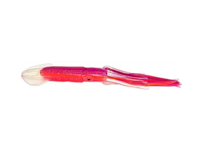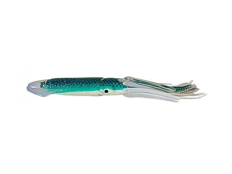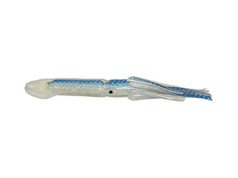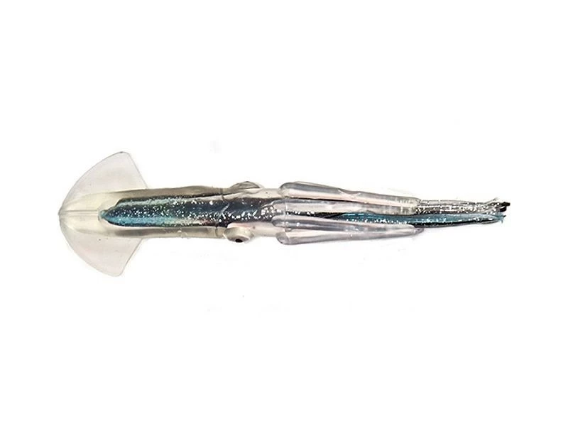 Squidnation Long Tail Rubber Mauler Squids are designed for that extra flash needed to really agitate a fish into attacking. Its no secret that fish react. These Long Tail Rubber Mauler Squids stimulate that instinct to react. The UV infused clear mauler squids glow aqua blue in the water added with the colorful skirt and extra tails make of a perfect bait or teaser to entice a marlin, sailfish tuna, dolphin or wahoo into attacking. 9 inch rubber squids with a total length of 11 inches with the extra long tails.