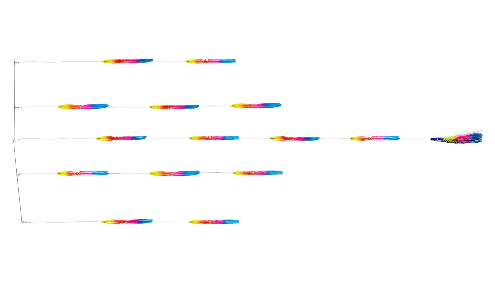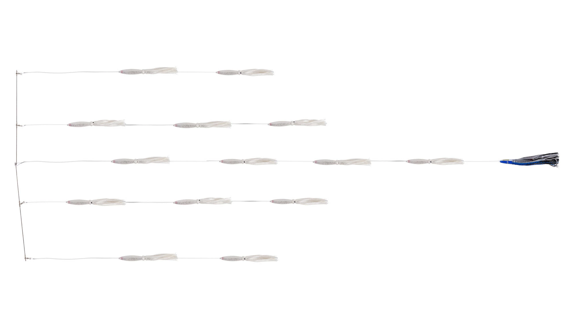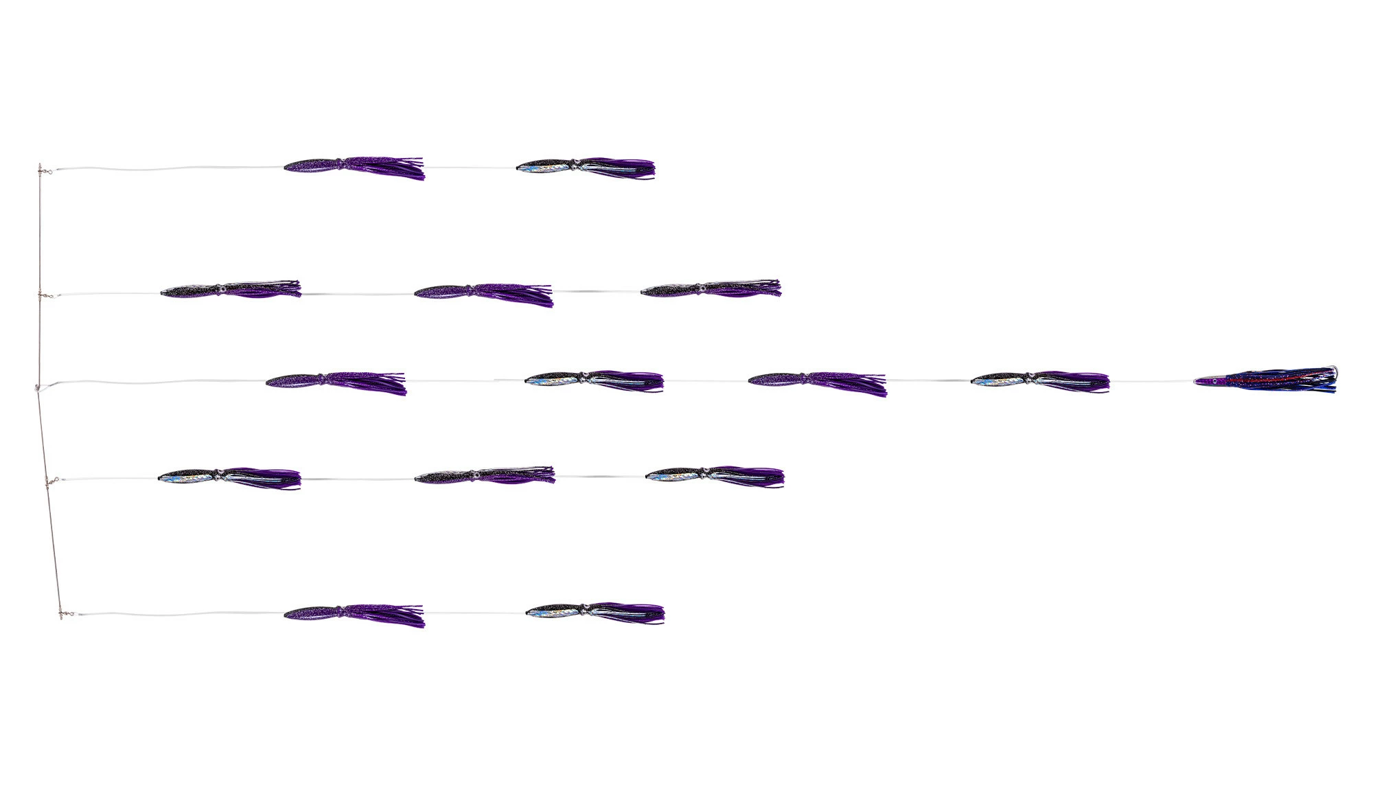 Tormentor Squid Spreader Bar includes fourteen high quality Tormenter Squids rigged on 200 lb. mono with a “Tuna Bandit” end bait. It’s rigged with a 9/0 Double + Strength Stainless Steel Hook. These are lightweight and guaranteed to produce fish. This bar rigs works well for Bluefin Tuna, Yellowfin Tuna, Bigeye Tuna, Dolphin and Billfish.