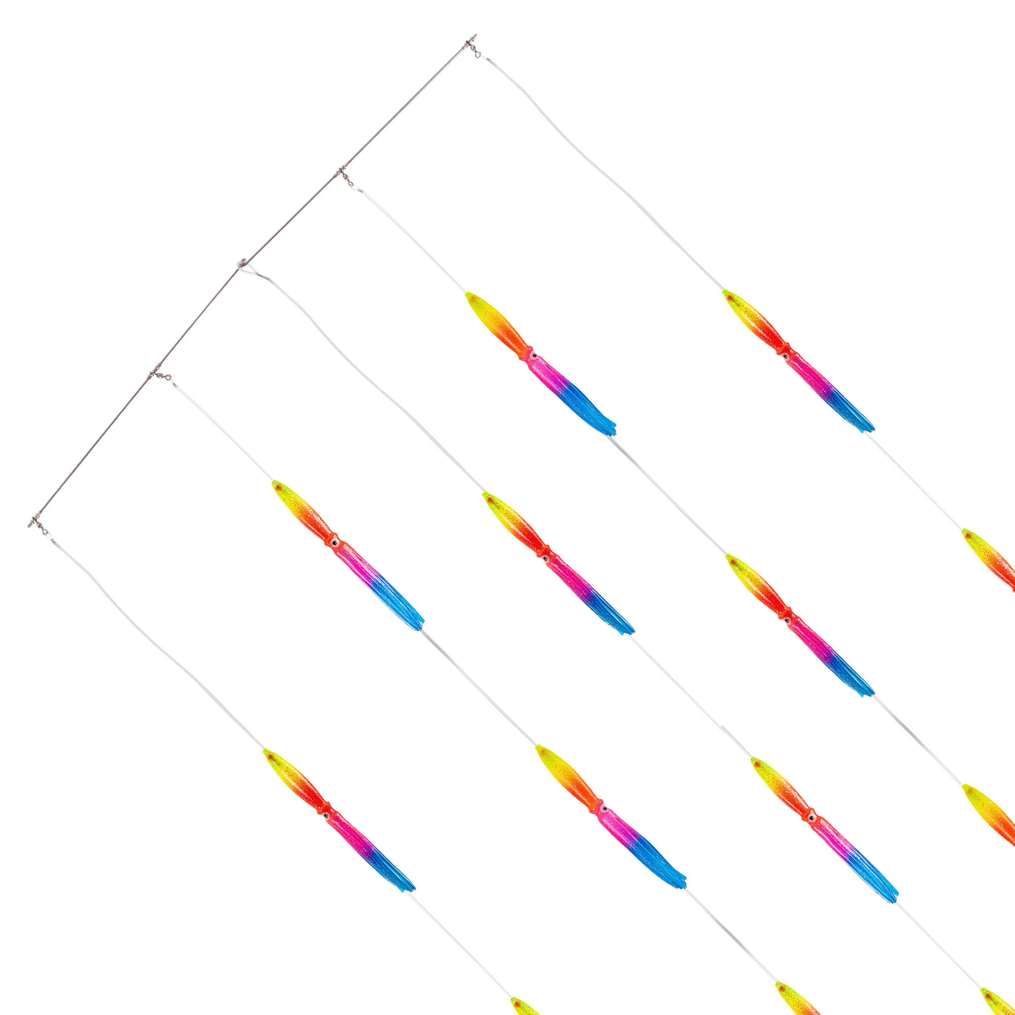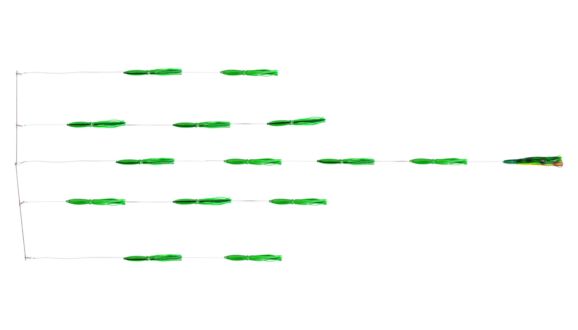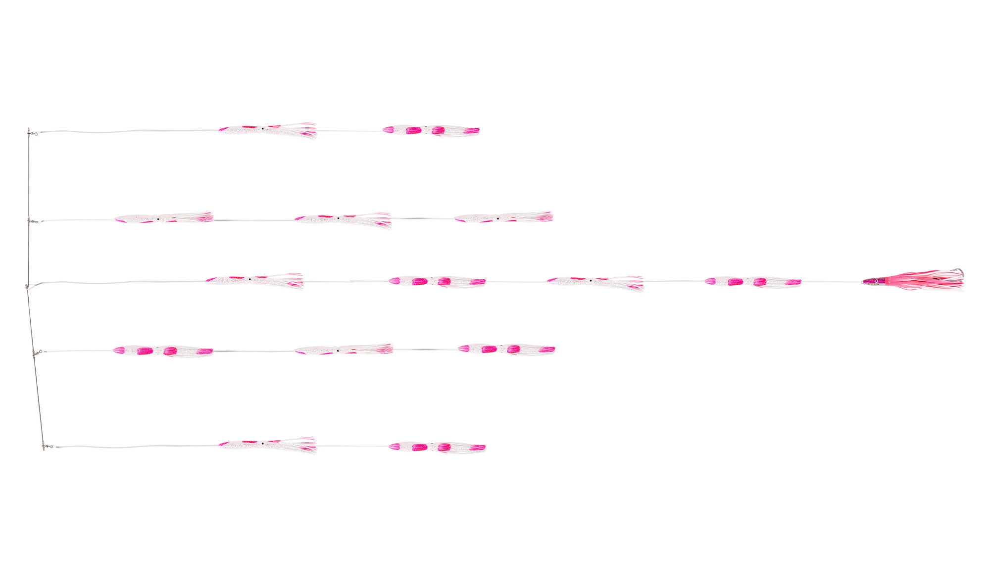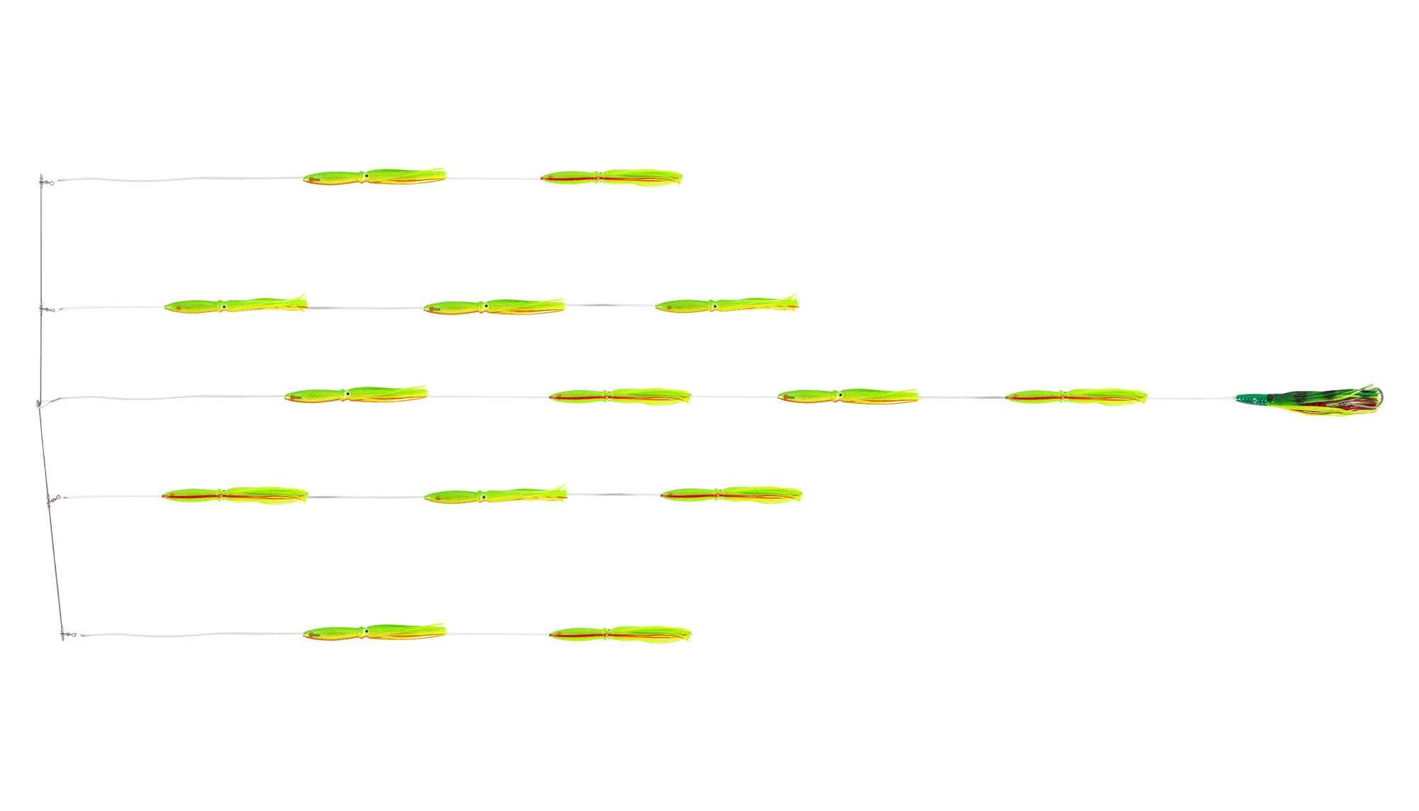 Tormentor Squid Spreader Bar includes fourteen high quality Tormenter Squids rigged on 200 lb. mono with a “Tuna Bandit” end bait. It’s rigged with a 9/0 Double + Strength Stainless Steel Hook. These are lightweight and guaranteed to produce fish. This bar rigs works well for Bluefin Tuna, Yellowfin Tuna, Bigeye Tuna, Dolphin and Billfish.
