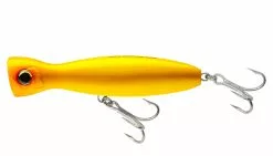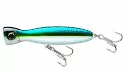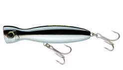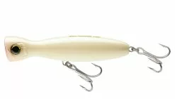 Yo-Zuri designed this top water popper lure to have a gigantic water pushing face, which makes it ideal for stop & go retrieves, a jerking technique, or a fast popping retrieve. The lure comes in two sizes, 5 1/4″ and a 6 1/4″, and is equipped with 3x heavy duty hooks and 3x heavy duty split rings.
